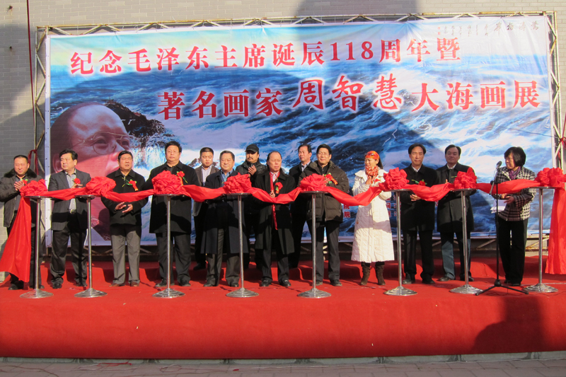 2011年12月26日上午,由中共东营市委宣传部、东营市文学艺术界联合会、国际美术家协会、国际美术家协会、中国大海画院、中国民族书画院主办;东营市美术家协会、东营市黄河美术馆承办的“纪念毛泽东主席诞辰118周年著名画家周智慧大海画展”在黄河美术馆开幕。东营市有关领导为展览剪彩,市县区文学艺术界、企业界,胜利油田有关领导及书画爱好者600余人出席了开幕式并参观展览。此次展览共展出作品61幅。 周智慧,笔名周天,湖南益阳人。三岁开始习画,18岁应征入伍,在海军南海舰队服役,海军军旅生涯25年。曾任海军俱乐部美术员、海军文化部创作员、海军展览馆馆长、中国民族画院院长,国家一级美术师、教授,国家民委高级职称评委,国务院特殊贡献专家等职。现任中国大海画院院长、中国大海研究会会长、文化部国家文物艺术品鉴定委员、国际美术家协会主席。他用十年时间,走过了北起鸭绿江边,南到北仑河谷祖国的一万八千公里海岸线,他到过了很多岛屿,画了三百余本速写,到目前为止,已创作许多幅以大海为题材的国画作品,大海已成为他的代表作。他用三十年时间总结、融汇传统绘画和现代绘画各种技法,中西结合,形成独具特点的海派风格,创立自己的大海画派,填补了中国绘画史上画海无大家的空白。先后在美国、日本、俄罗斯、东南亚等国际、国内举办“周智慧大海画展”九十余次,出版《中国画山水画技法》、《大海画技法108法》、《周智慧大海画集》、《周天画海》等著作。其作品被党和国家领导人作为礼品赠送国际友人。荣获“联合国世界文化艺术大奖”、“俄罗斯艺术科学院院士”、“全国山水画百杰”、“世界书画艺术名人”、“世界金奖艺术家”称号,被誉为“中国人民的伟大艺术家、中国画海第一人”。