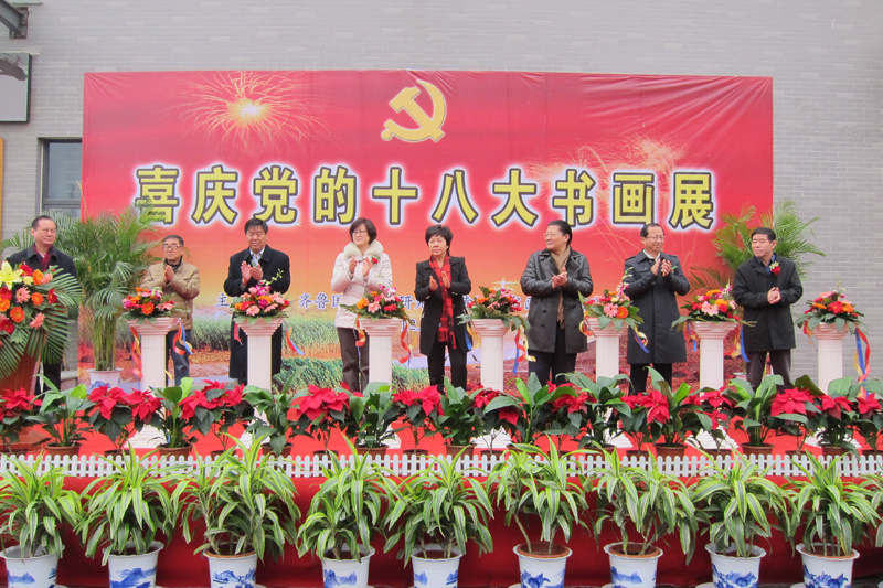 2012年11月16日上午九时“喜庆党的十八大书画展”在东营市黄河美术馆举行。本次书画展共展出、书法、国画作品100余幅。图为开幕式现场。