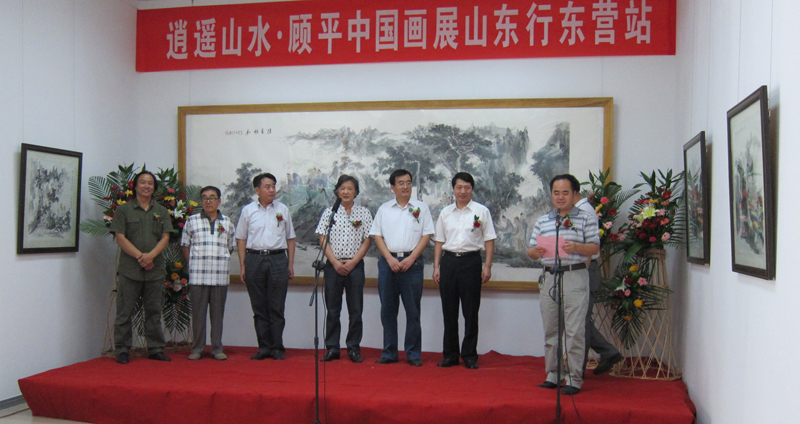 | 2013年9月7日上午由东营市委宣传部、东营市文化广电新闻出版局主办,东营市黄河美术馆承办的《逍遥山水-顾平中国画展山东行东营站》在黄河美术馆开幕。参加此次开幕仪式的领导及嘉宾有:东营技师学院院长马洪军先生;中共东营市委宣传部副部长崔建国同志;东营市文广新局党组成员韩祥明同志;黄河口书画艺术研究会常务副主席刘春泉先生;东营市美协副主席、黄河口湿地画派研究院院长、东营职业学院美术教授石建勋先生;东营市书协副主席、黄河美术馆副馆长兼秘书长崔士军先生;东营市黄河美术馆馆长景宁先生等。 |