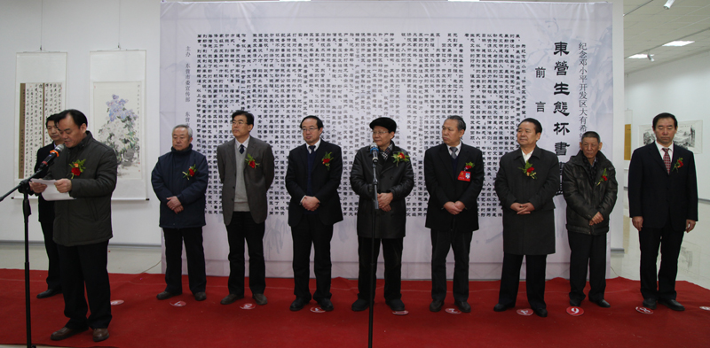 | 2014年1月11日上午,由中共东营市委宣传部、东营市文联、市黄蓝书画研究院主办,市书协、美协承办的《东营生态杯书画展》在黄河美术馆举行开幕仪式。参加此次展览的领导和嘉宾有:市委常委、宣传部长,东营经济技术开发区党工委书记张润国同志;省委第七巡视组原组长、市文联名誉主席马登雨同志;原市政协主席陈锡山同志;原市人大常委会第一副主任姜振邦同志;东营市职业学院党委书记张洪生同志;东营市技师学院党委书记、市文联名誉主席尚观华同志;市文联党组书记、主席任勤林同志;市文联名誉主席、市书法家协会主席许好成同志;胜利油田美协主席宋坦克同志。参加今天开幕仪式的还有市直和各县区的书法家、画家,宣传部门、各级开发区以及社会各界支持和喜爱书画艺术的领导和朋友们。 |