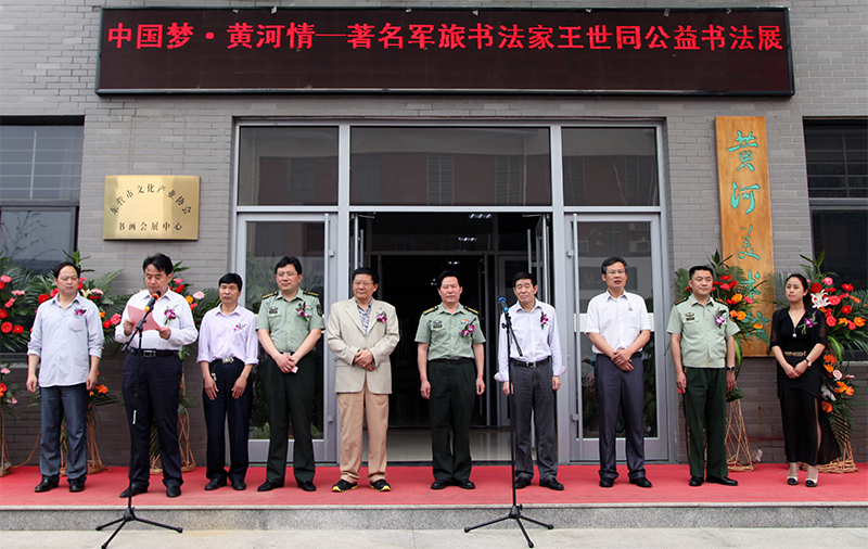 2014年5月25日上午,“中国梦•黄河情—著名军旅书法家王世同公益书法展”在黄河美术馆开幕。此次参加开幕仪式的领导和嘉宾有:东营军分区政治部主任刘志明大校;著名书法家、齐鲁国学书画研究院院长,黄河口书画艺术研究会主席,中国国学院大学教授、博士生导师,中国书协会员,东营市政协原主席陈锡山先生。中共东营市委宣传部常务副部长、中国书法家协会会员、山东省书协理事候岱印先生;中共东营市委宣传部副部长、东营市文化广电新闻出版局局长崔相国先生;武警东营支队政委孔祥谦上校;著名青年工笔画家牛国玉女士;东营市艺术馆馆长李广安先生;黄河美术馆馆长景宁先生。