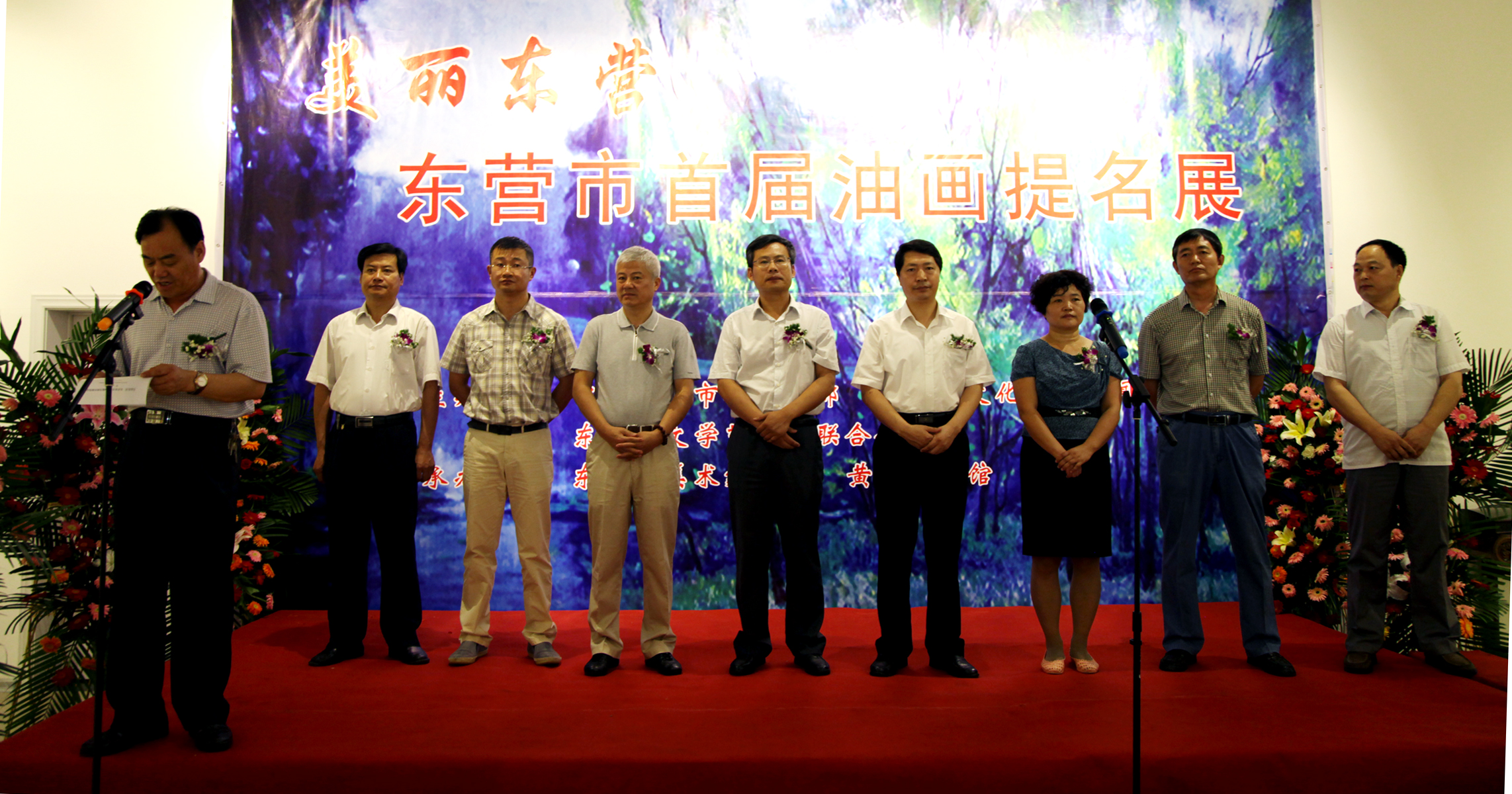 参加展览的领导和嘉宾(自左至右):东营市文学艺术界联合会主席、山东省美协副主席任勤林;东营市文联副主席王玉文;著名青年油画家赵俊忠;上海德通投资有限公司董事长苏永昂;中共东营市委宣传部副部长、东营市文化广电新闻出版局局长崔相国;中共东营市委宣传部副部长崔建国;东营市文联副主席周长虹;东营市美术家协会主席陈宏光;黄河美术馆馆长景宁。