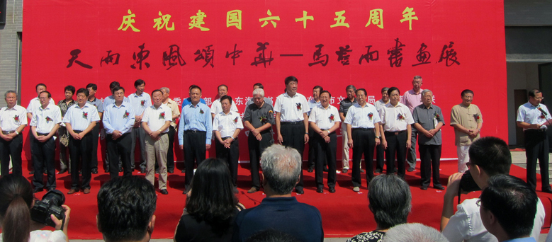 2014年9月13日上午,庆祝建国六十五周年,《天雨东风颂中华——马登雨书画展》在东营市黄河美术馆开幕。 出席开幕式的领导和嘉宾有:山东省政协老领导李殿魁、中共东营市委书记刘士合、山东省文联党组书记于钦彦、东营市人民政府市长申长友、山东省巡视六组组长蒋文彩、山东省委群众路线教育督查组组长王同君、王文升,东营市政协主席吕雪萍、东营市人大第一副主任田振玉、东营市委秘书长李金昆、东营市委常委、副市长、宣传部部长张润国,山东省纪委正厅老常委徐东萌、中国企业报社长吴昀国,东营市老领导刘国信、陈锡山、于树健、姜振邦、张传堂、聂绍光、安家训、曹连杰等。 著名书法家、山东海右书画院名誉院长娄以忠,山东画院老院长、山东海右书画院总策划王奎章,山东海右书画院院长于海龙等出席了开幕仪式。 著名画家、中国美协副主席何家英发来贺信。 庆祝建国六十五周年,《天雨东风颂中华——马登雨书画展》共展出马登雨先生创作的书画作品190幅,其中书法作品22幅,国画作品168幅,黄河口地区书画爱好者300余人参加了开幕仪式。 |
