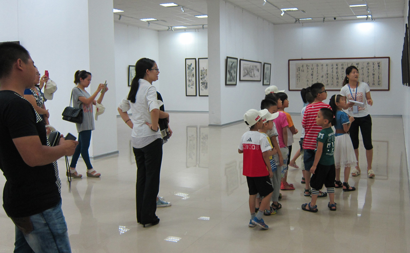 东营市美术馆讲解员正在向小朋友们介绍国画作品。