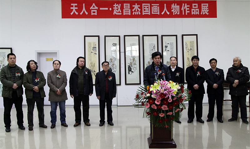 2015年2月11日上午,由山东黄河文化艺术公司、东营君行文化艺术中心主办,黄河美术馆承办,松竹斋画廊、国风堂画廊协办的“天人合一·赵昌杰国画人物作品展”在黄河美术馆开幕。 出席开幕仪式的领导和嘉宾有:著名书法家、黄河口书画艺术研究会常务副主席刘春泉;东营市政协书画研究会副主席兼秘书长、黄河口书画艺术研究会副主席兼秘书长刘金保;黄河美术馆副馆长、东营市书协副主席吕永和;山东省美协理事、东营市美协常务副主席兼秘书长王锡强;东营市美协驻会副主席任艳华;东营市画廊协会副主席兼秘书长、光辉画馆馆长吴光辉;三韵堂画廊经理任从功。