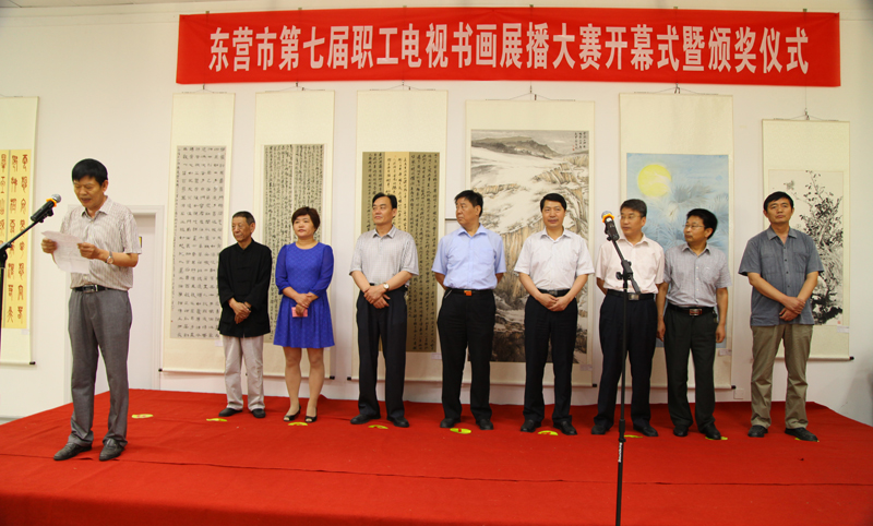 为庆祝中国共产党成立94周年和反法西斯战争胜利70周年,歌颂美好生活,弘扬社会主义核心价值观,由东营市总工会、东营市文联、东营市广播电视台共同主办,东营市职工文化活动中心、东营市美术家协会、东营市书法家协会承办的“东营市第七届职工电视书画展播大赛开幕式暨颁奖仪式”在东营市黄河美术馆举行。