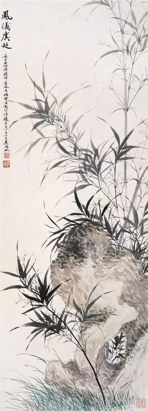 画雨竹枝略弯,叶下垂偏一边。“个”字“介”字相互破,各种分字画其间。行笔提按需求稳,出锋必须要果断。有主有宾分成组,整体还需连成片。密处求疏疏处密,最忌堆砌和散乱。画竹关键在组合,功夫都在笔墨间。