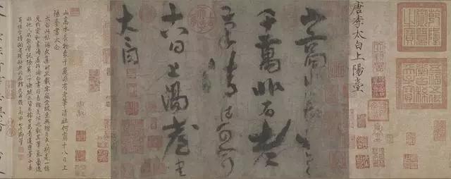 展览中的另一幅重要作品《上阳台帖》,“山高水长,物象千万,非有老笔,清壮可穷!十八日,上阳台书。太白。”寥寥二十余字,诗仙李白那洒脱豪迈的性情似乎跃然纸上,仿佛可以以字识人。作为李白迄今唯一存世的墨迹,虽然尚有一些不同看法,但从宋代至今,流传有序的题跋都显示出这件作品的罕见与珍贵。