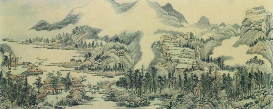 现藏于济南市博物馆的王宸《山水图》卷(上下两图为作品局部)为纸本设色,纵38厘米、横541厘米,全图无款,拖尾有其子王麟孙跋文18行。在此长卷中,画家自右向左展现出扁舟荡漾于江面、烟云缭绕于山林的景色。观者可以跟随画家的构图视角,以眼为舟,随着江面的水流,沿着水边的山石逐渐进入画家描绘的美景之中。在此画中,画家将主要景色安排在右侧,即画面的前段。此部分着重表现了崇山峻岭、云雾缭绕、茂树层林的景色。画家对山石、树木的刻画以及氛围的营造处处都显现出王原祁遗风。王原祁在绘画技法上也继承家学,并多宗“元四家”,尤以黄公望和倪云林为主。黄公望又多宗董源、巨然,“喜合赭石、藤黄着浅绛色”(陈师曾语)。王原祁在师古的基础上,使笔法更加苍劲,气韵更为高淡,“盖合冶黄、倪,自成面目”(同上),对丘壑、峻岭的描绘也更加“局势浓密”(同上)。他的作品笔致深远,“阴阳、远近、疏密、浓淡皆有迹可寻”(同上),有“平面中见立体之致”(同上)。黄公望的这些艺术特点在王宸此幅《山水图》卷中也有所体现。如为了体现山石的巍峨与峻峭之感,画家多用披麻皴进行皴画,又以淡墨与淡赭色进行渲染。在皴法的分布上,画家也较为注重疏密的安排,只是在对远山的处理上未呈现出最理想的空间伸缩感。如远处的山峰多采用与近景山石相同笔法、墨色的皴擦,在渲染上也较为浓重。在林木的刻画上,画家以赭、浅绿、墨色进行颜色浓淡的区分,增添了画面的层次,使景致显得郁茂繁密。画家对于层峦连绵、云海茫茫、幽静惬意氛围的营造颇为到位。经过画面左侧的层峦叠嶂,可见到画面中段有一小桥架于两岸之间,拄杖老翁闲步于桥上。鳞次栉比的草屋、亭台建于山下,屋内人执茶相谈,又有两人于屋外空地相对而行。几株树木点缀于屋舍间,屋舍周围有溪水环绕。远处江面上,几叶扁舟摇曳于云雾中,透露出悠闲恬静之意。画面后段多为峭壁悬崖,寺院、寺塔坐落山间,又点缀有水榭、房屋。画面左侧湖泊浩瀚、扁舟荡漾,岸边垂柳依依、芳草萋萋,一耕农扶锄而归。画家对此段景色的刻画较之前段更为放松、自然,近景山石与后方山石及大面积水面形成了疏密的对比,笔墨也较为苍润。