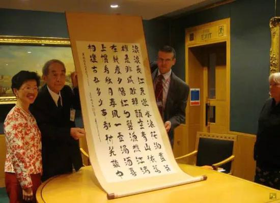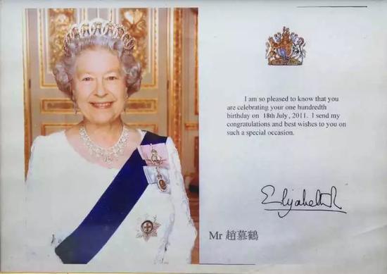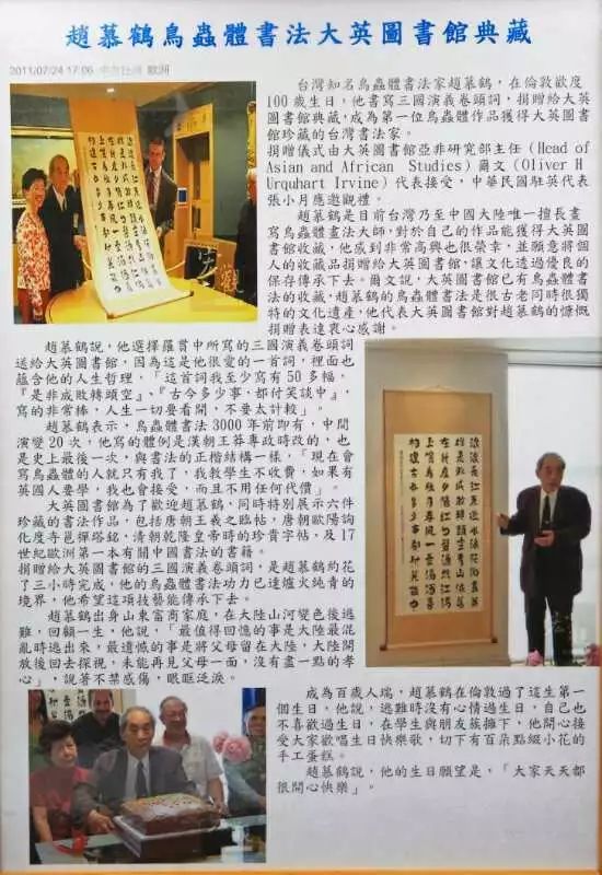 2012年老人一百岁的时候,老人创作的鸟虫体书法作品被大英图书馆典藏藏,英国女王亲笔确认签字,承载中华文明基因的古老鸟篆书法再一次飞进了世界艺术的最高殿堂(大英国图书馆曾收藏过中国的鸟书作品,可见其对中国鸟书文化的珍视),这不仅是对中国鸟虫体书法的又一次接纳认可,更是对赵慕鹤人格精神的嘉奖肯定,这与英国威斯敏斯特大教堂对中国云南人王志明的接纳肯定;以色列犹太民族将中国湖南益阳何风山视为国际义人的感恩肯定,有着异曲同工的崇敬之意,因为比艺术更有价值的是艺术家的人格。