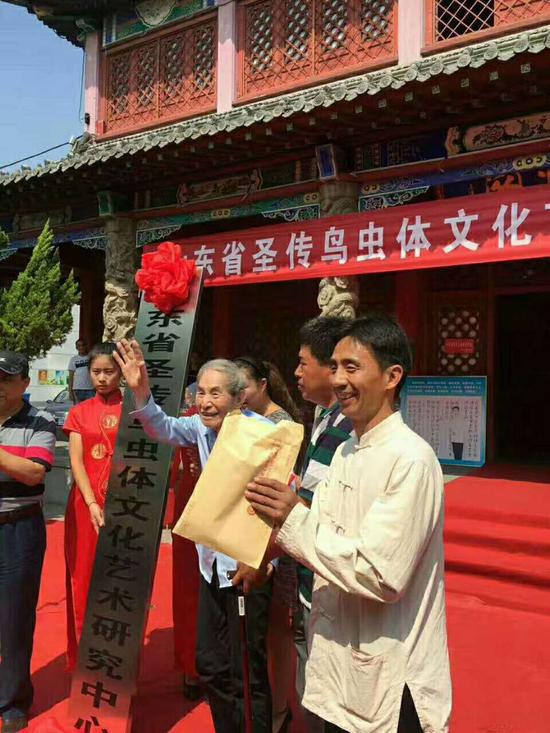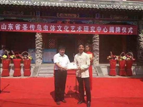 三、鸟虫体书法成功申请为山东济宁非物质文化遗产保护项目。古老鸟虫体书法承载着中华本土原始的文明基因,重建中国文化的使命,已经起程。2016年9月16日,圣传鸟虫体书法文化艺术研究中心在赵慕鹤老人的家乡,山东省金乡正式成立,当地多名领导出席了揭牌仪式。赵慕鹤老先生在大陆唯一的入室弟子,山东金乡鸟篆青年书法家候新桥在仪式上献词。当时已经一百零五岁高龄的赵慕鹤老先生专程从台湾省赶过来,并于现场挥毫泼墨,为研究中心落成题词。