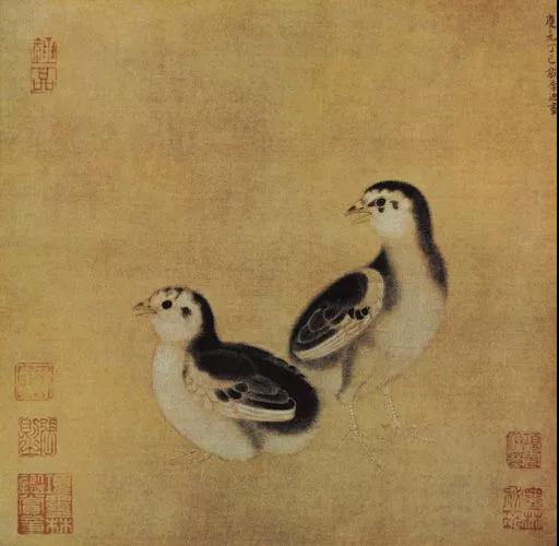《鸡雏侍饲图》图绘两只雏鸡一卧一立,面朝同一方向,屏气凝神,仿佛听见母亲觅食的召唤,正欲奔去。画面描绘传神,将雏鸡嗷嗷待哺的情态表现得淋漓尽致,充分反映了温馨的农家情调。画家用黑、白、黄等细线密实地描绘出雏鸡毛绒的质感,生动地绘出鸡雏幼小可人的生动神态,体现了深厚的绘画功力。此图为李迪晚年所画,构图极其简洁,无任何背景相衬,却捕捉住了鸡雏回眸的刹那间神情,动人心弦。按所见李迪绘画真迹,有自题年款作于南宋庆元十四年丁未的,如上溯到北宋宣和七年,也需要七十三年,那么,李氏在世之年也该在九十以上了。据此,有人对此画是否为李迪所作,提出质疑。