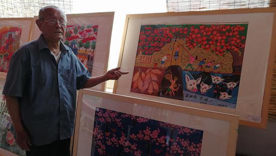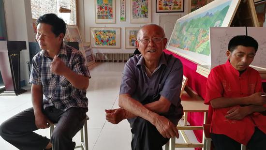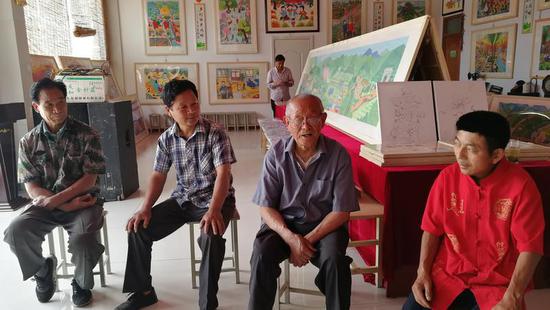 王坟镇的山村绘画技艺有着悠久的传承。一进展厅,记者见到王坟镇土生土长的四位画家。自称“80后”的王坟村村民吴冀生今年81岁了,他人老心不老,向记者介绍近百年来王坟镇上走出的画匠们,是如何自己制作水粉、墨块的。