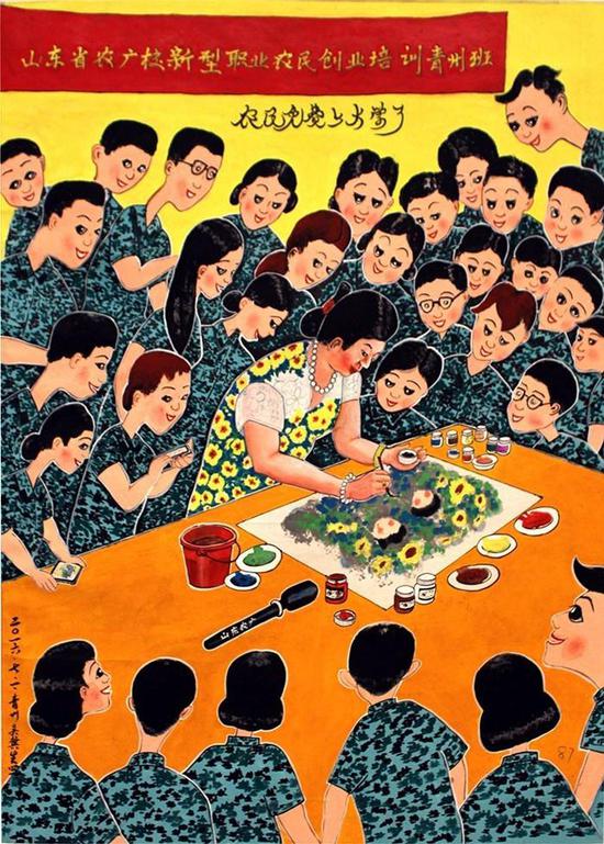 传统总能在现实中蔓延。谈及自己的画作,吴冀生介绍道:“这是今年植树节,我拿着相机出去拍的素材,回来后学着用达芬奇画《最后一次晚餐》时的分组法,删繁就简,把人物的分工画出来;这是去玲珑山下照杏花,跟着我学木匠的徒弟在那儿养了160群蜜蜂,农民画不是讲变嘛,我就让蜜蜂像小孩一样跳舞,只是这养蜂人画得有点胖。”学农民画之前,有着美术功底的吴冀生,早在1958年时就曾在青州南门一带的墙壁上画过宣传画。后来,他当过木匠,学着镀镜子,装裱玻璃画,再后来绘制玻璃钢漆画。2014年,青州刚开始搞农民画培训时,还没有设年龄坎,吴冀生参加了几次培训,收获颇丰。“那几次培训,年轻了好几岁。”