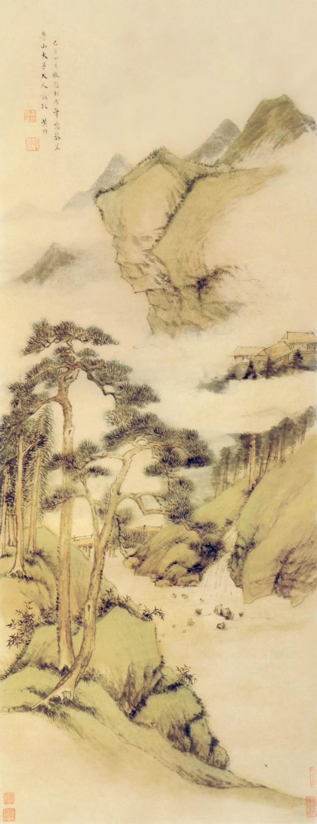 《仿赵松雪笔意图》为纸本设色,纵108.5厘米、横44.5厘米。画家在画面左上方款署:“己亥四月,仿赵松雪笔意,恭呈鲁山夫子大人诲正。黄均。”钤“黄均信印”“穀原”白文印。画家绘山麓春景。画面中,清晨的万物隐现在未散去的薄雾中。在湿润的雾气中,古松更显飒爽之姿。画家选择高远和深远相结合的构图形式,以淡墨绘山石、树木,用浓墨点染,再施以淡淡的青绿和赭石进行渲染,使整个画面显得古雅清逸。远处层峦叠嶂,有苍茫云烟环绕于山峰,几座村舍在云霞中若隐若现,仿若人间仙境。近处古松成林,在烟云的衬托下显得郁郁葱葱。山涧流泉飞泻,曲溪蜿蜒而流,木桥架于溪水之上。