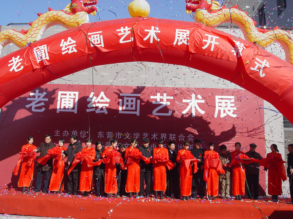 东营市有关领导为老圃绘画展剪彩(自左至右)东营市文化广电新闻出版局局长马洪军、东营技术学院党委书记尚观华、东营职业学院党委书记聂肇正、黄河口书画研究会常务副主席刘春泉、东营市原政协主席赵芳清、东营市委常委、宣传部部长田青云、东营市政协副主席、总工会主席王少飞、淄博画院美术馆执行馆长殷艳秋、东营市黄河美术馆顾问王友兴。中国书协会员、东营市书协主席、黄河美术馆馆长许好成主持了开幕仪式。