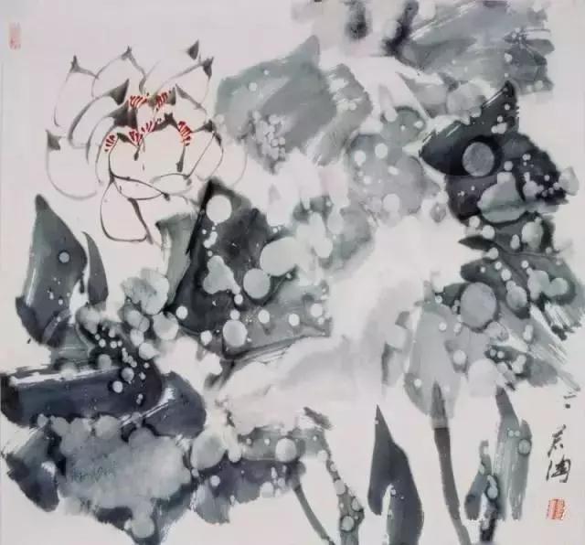 水破墨,与墨破水是相反的方法,在花鸟画上,表现出相反而且相成的效果。水破墨表现的效果丰富;墨破水表现出的效果厚重不板滞。如早晨时分的花木树叶,可以用水破墨;表现午后晚秋时的花木树叶,可以用墨破水。我经常在画晨时芙蓉花叶时,爱用水破墨;画雨雾中的牡丹时,也爱用此法。达到即清即朦的效果。画秋时湖鹭、栖在芦苇旁的芦苇用墨破淡(水色)。冯今松先生的《红莲斌》,就是采用此方法,用带色的水笔,破勾画的荷叶,使荷叶朦胧感强,而且笔触若隐若现,浑然一体。感观效果非常清新。